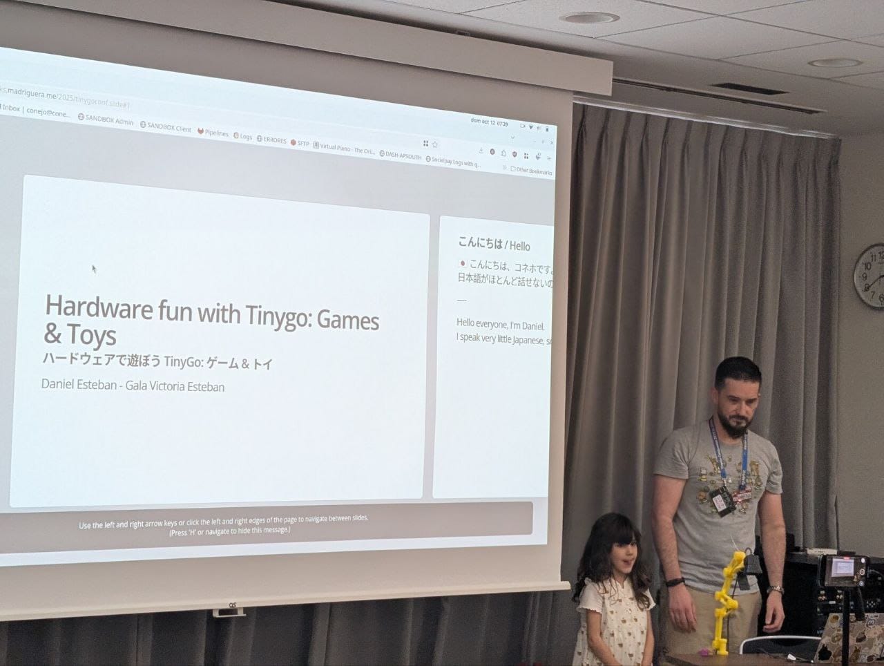 My daughter Gala joined me to give the talk. She’s been excited to help since last FOSDEM, and unlike her dad, she’s not afraid of the stage. I started off on the wrong foot, even though it was the talk I had prepared most thoroughly, checking everything three times, but things happen. I should have paused to regroup, but... if FOSDEM and other conferences felt like being hit by a train, this one was like being hit by multiple trains at once. I talked about different projects I’ve built, using each one to showcase the various features and possibilities of TinyGo, focusing on toys and games: GopherBadge, Nametag, Gopherino, FireFly, GameLink… I hope people liked it, and maybe I inspired someone to start tinkering with TinyGo, though honestly, they already have a very lively community with lots of amazing projects.